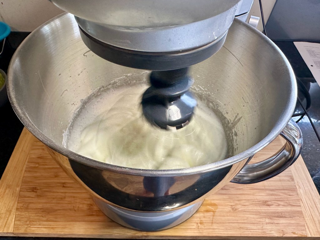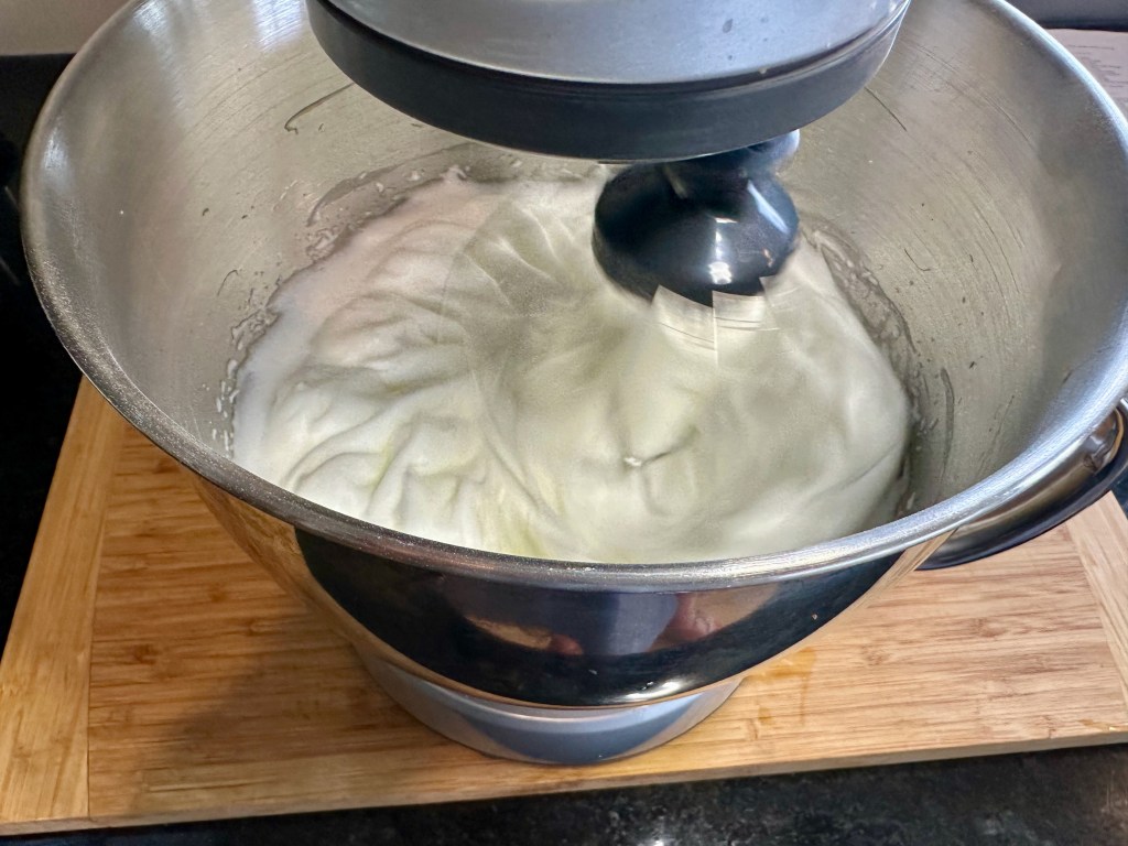 - Add the cream of tartar and keep whisking on high speed until stiff peaks form.