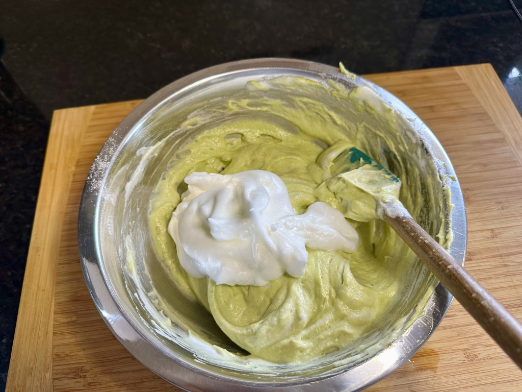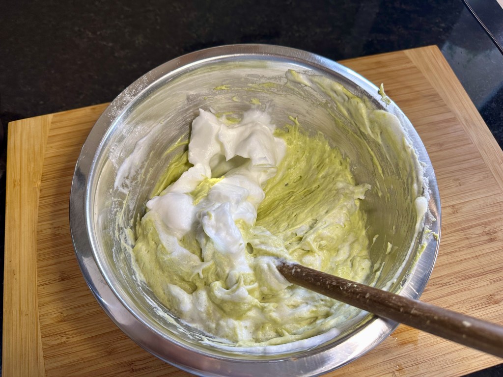 - Add the buckwheat flour and baking soda to the bowl with the egg whites.