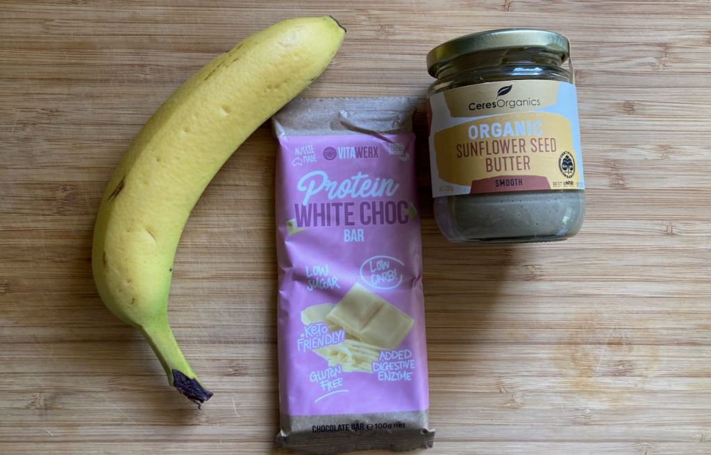 I’m trying different things as snacks at the moment; I had been munching on yoghurt and fruit for a while, so I needed to switch things up a bit. I had a stack of bananas and some protein white chocolate in the cupboard, so I thought I would have a go at making my own banana bites.