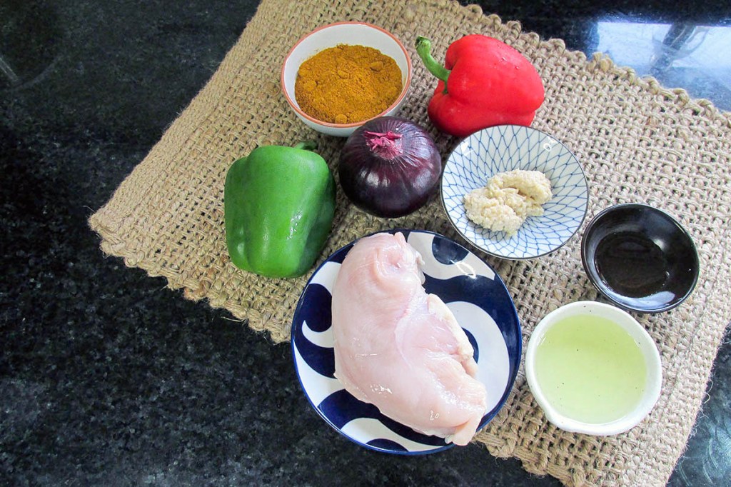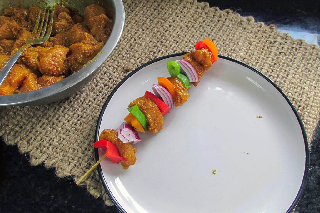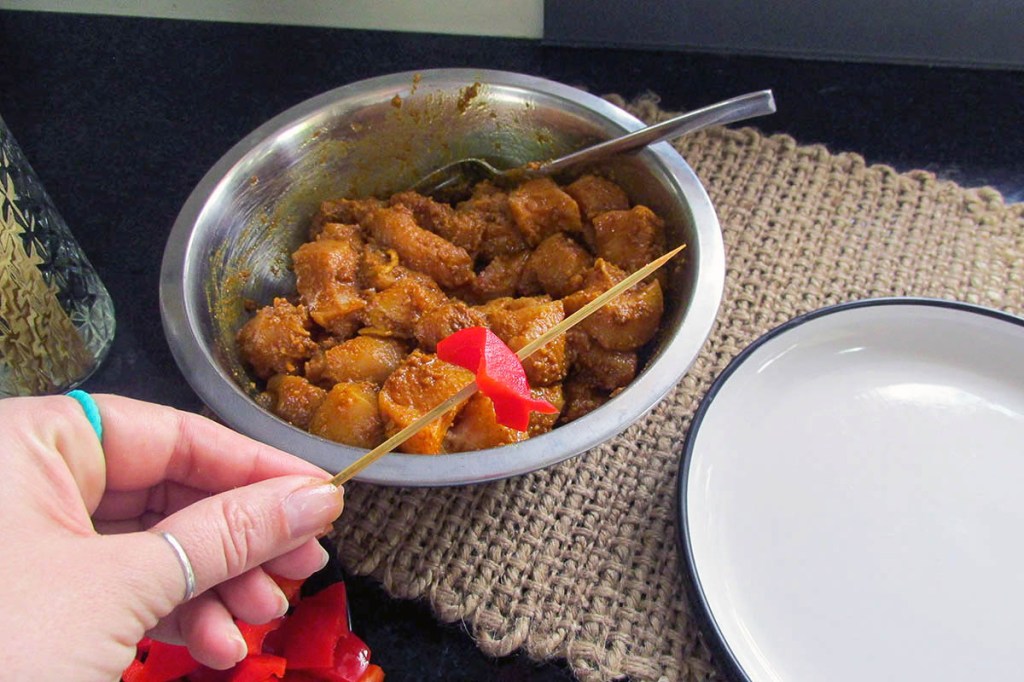 Thread the chicken, onion, pepper and peppers onto soaked bamboo skewers.