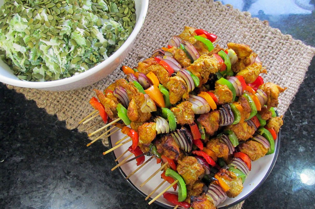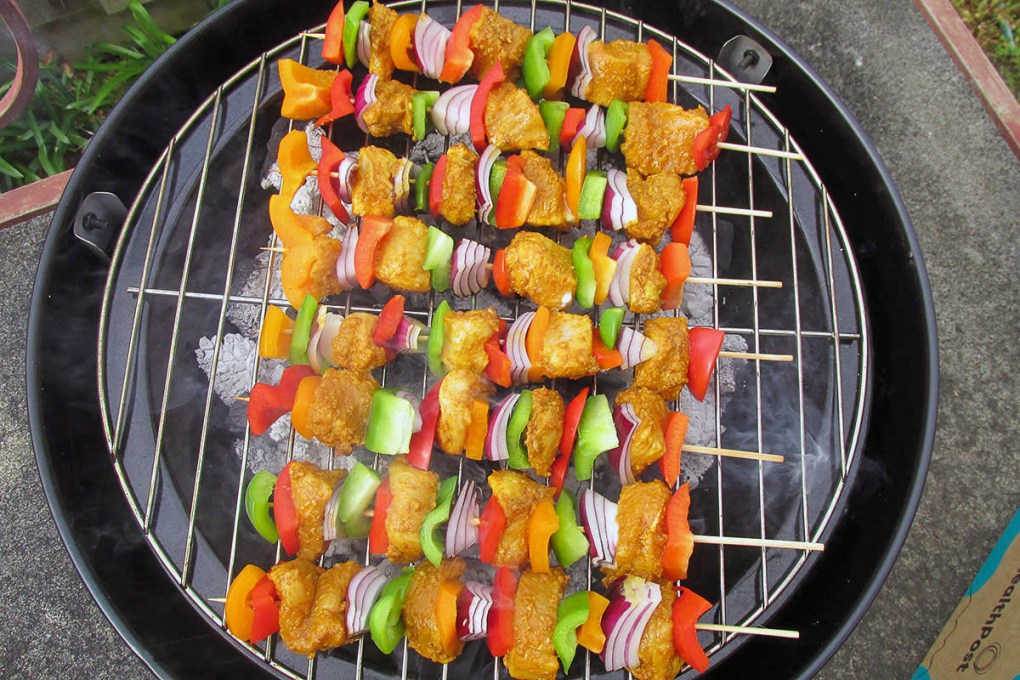 While I have nothing against the gas BBQ, I prefer the charcoal BBQ results. Charcoal BBQS take longer to set up and start cooking with, but once they are up and running, they are straightforward to use and can look after themselves and cook your food without too much effort from you. I am not a BBQ expert, but I know what works well for my cooking style and the recipes I have created or used. For this recipe, I set my BBQ up for indirect heat and put the skewers on to cook once all the charcoal had burned and was white. The BBQ internal temperature was around 300 degrees C or 600 degrees F, meaning the meat and veggies were cooked in minutes. Getting the temperature right before you put your food on the BBQ is key. If you put the food on when the BBQ is too hot, you end up with meat that is burned on the outside and raw in the middle. This is dangerous when you are cooking chicken.