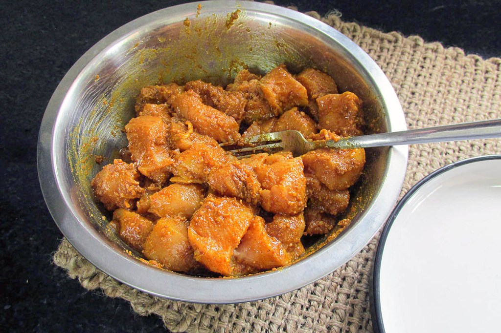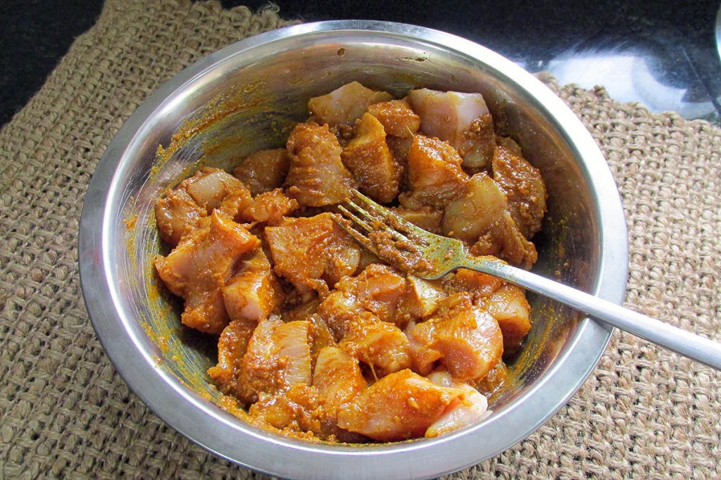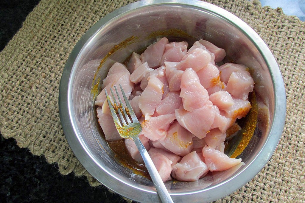 - Add the chicken to the bowl with the tandoori paste and mix to coat the chicken.