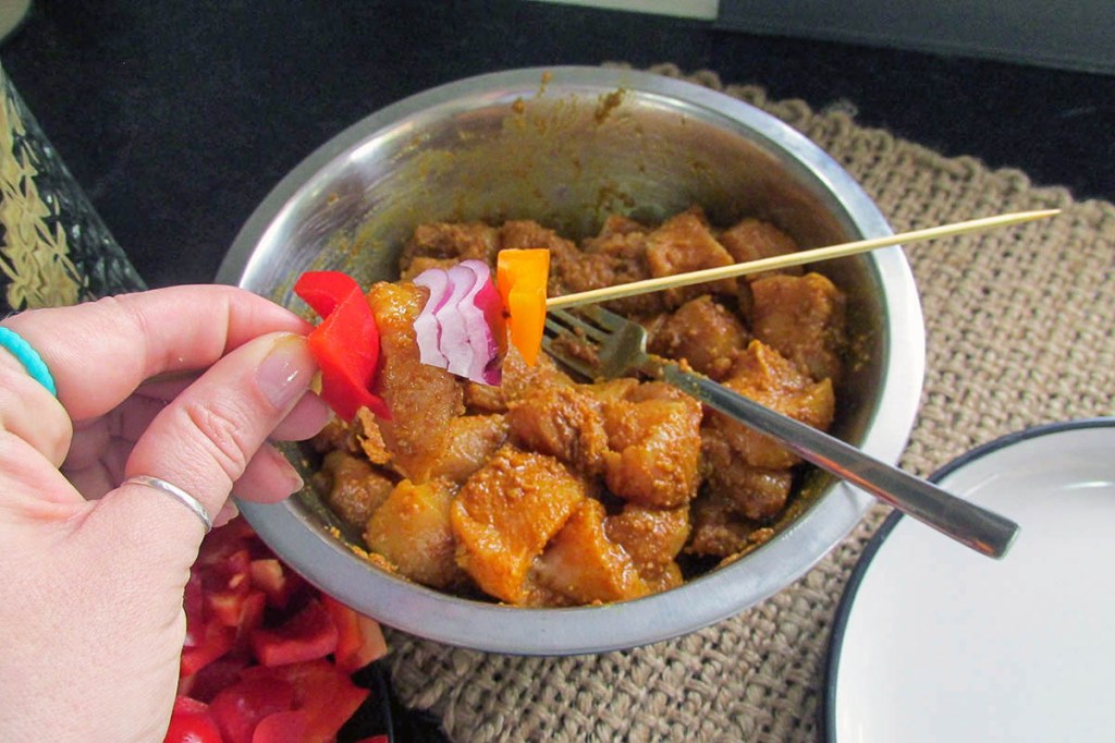 - Thread the chicken, onion, pepper and peppers onto soaked bamboo skewers.