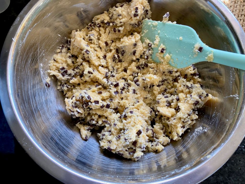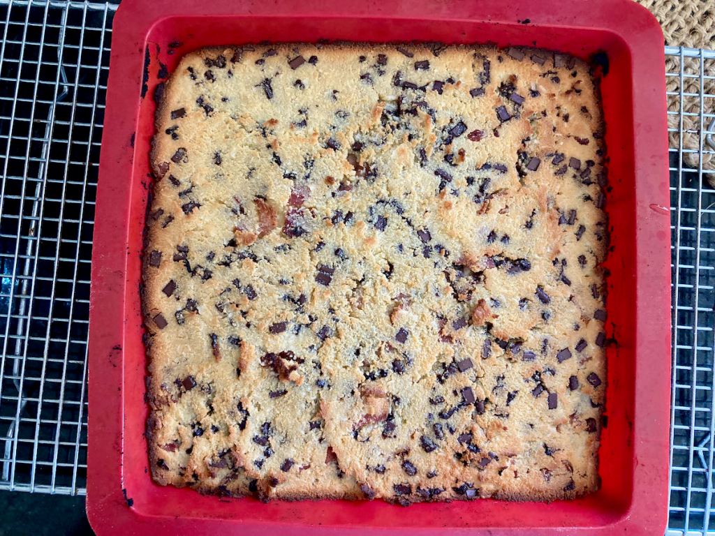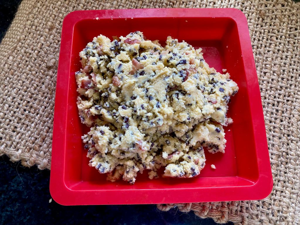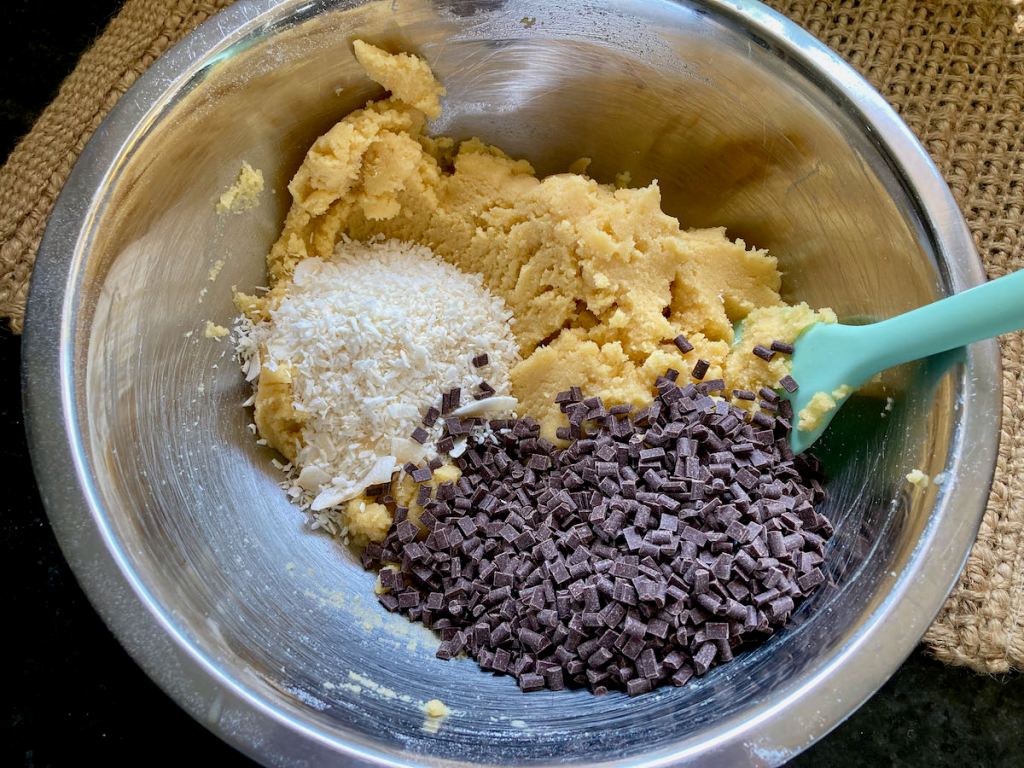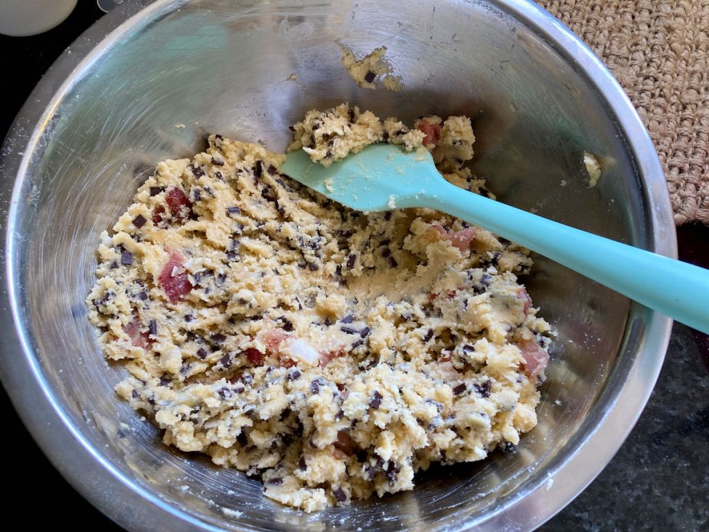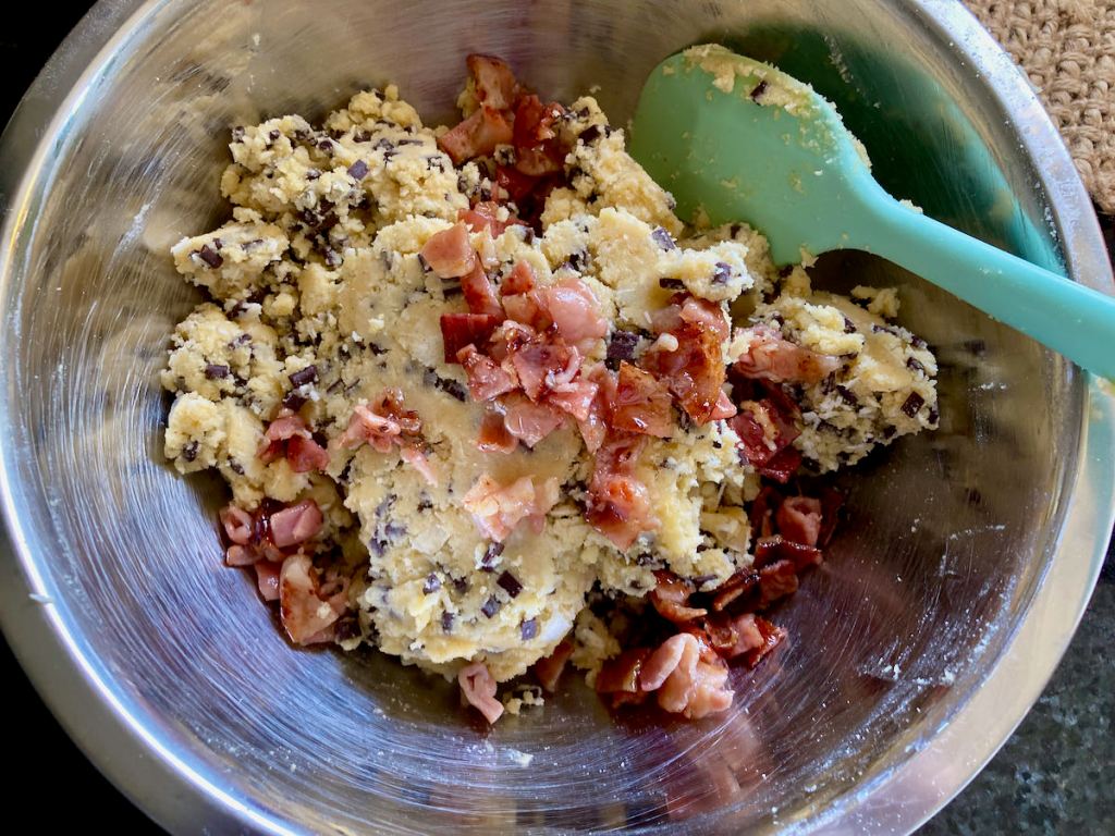 Stir in the shredded coconut, six slices of candied bacon bits and chocolate chips.