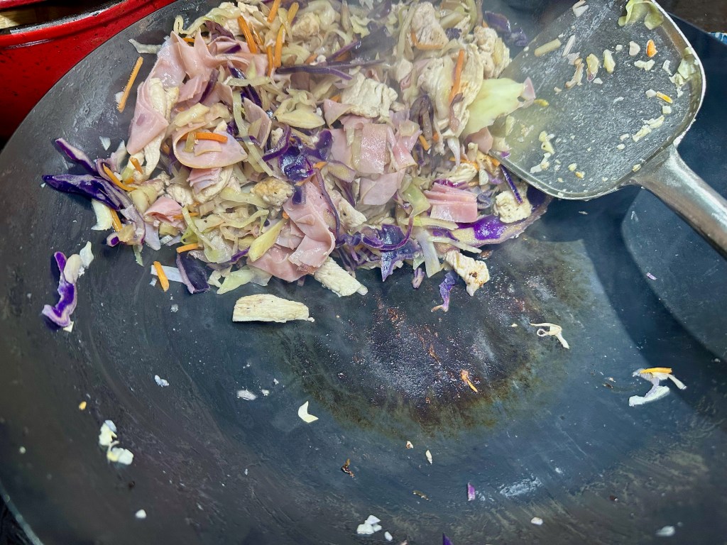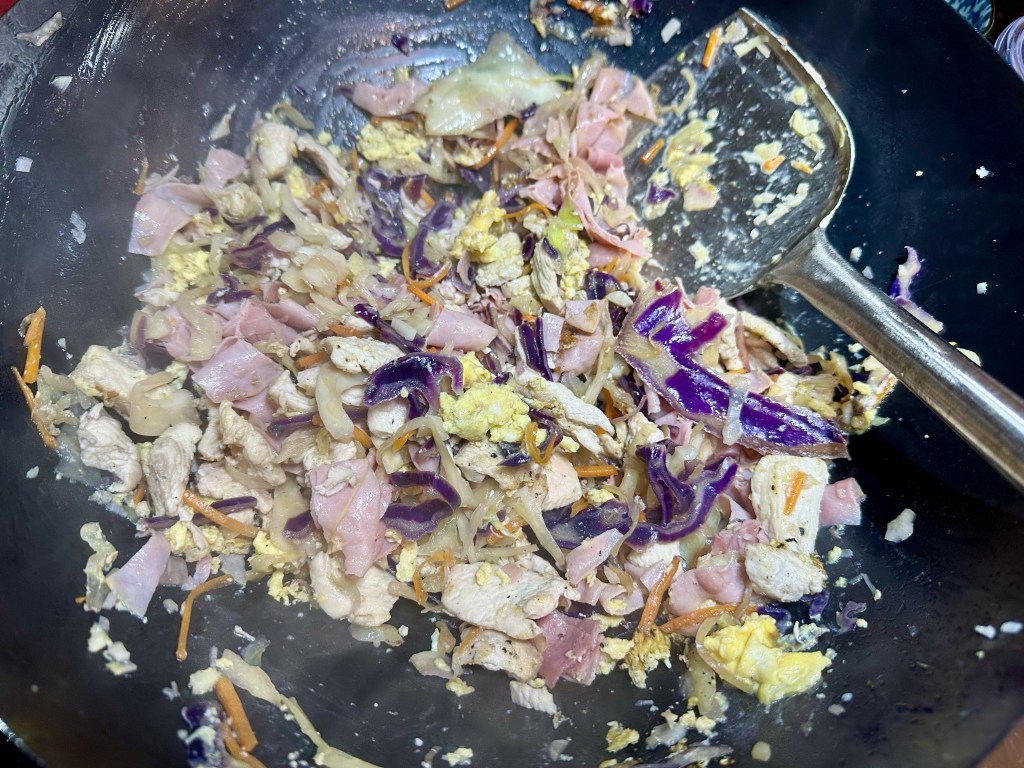 - Thread the chicken, onion, pepper and peppers onto soaked bamboo skewers.