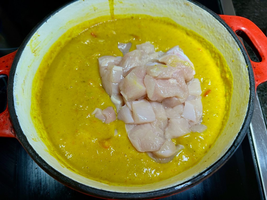 - Add the chicken to the bowl with the tandoori paste and mix to coat the chicken.